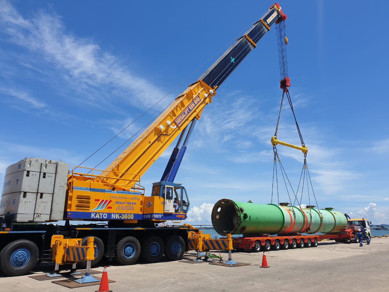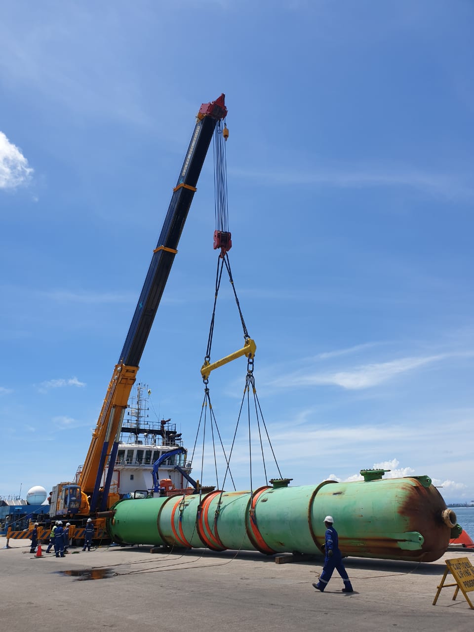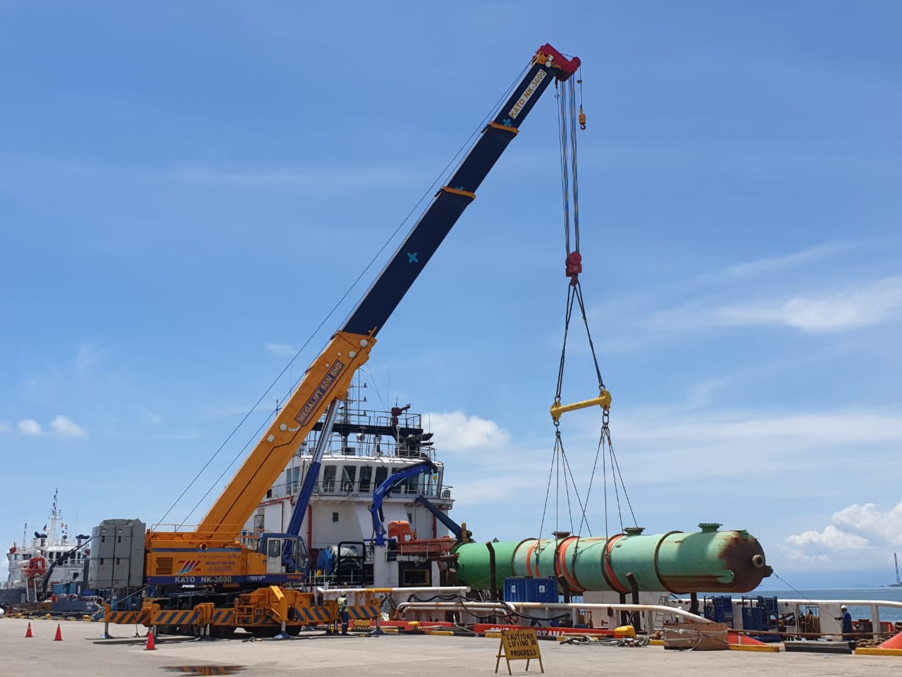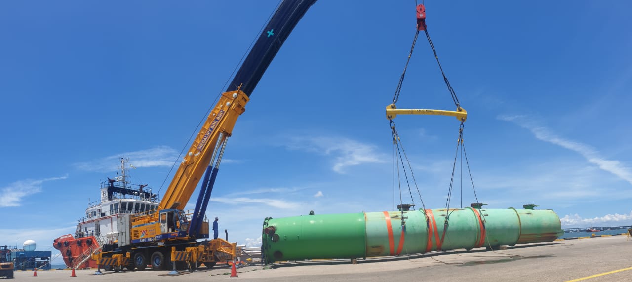AMEC Wood Offshore Rejuvenation Project. May 8, 2020 | Projects Unloading of Old Deaerator Tower from Brupars Pertama Vessel to Megalift Commetto Hydraulic Trailer using 360te Mobile Crane.
